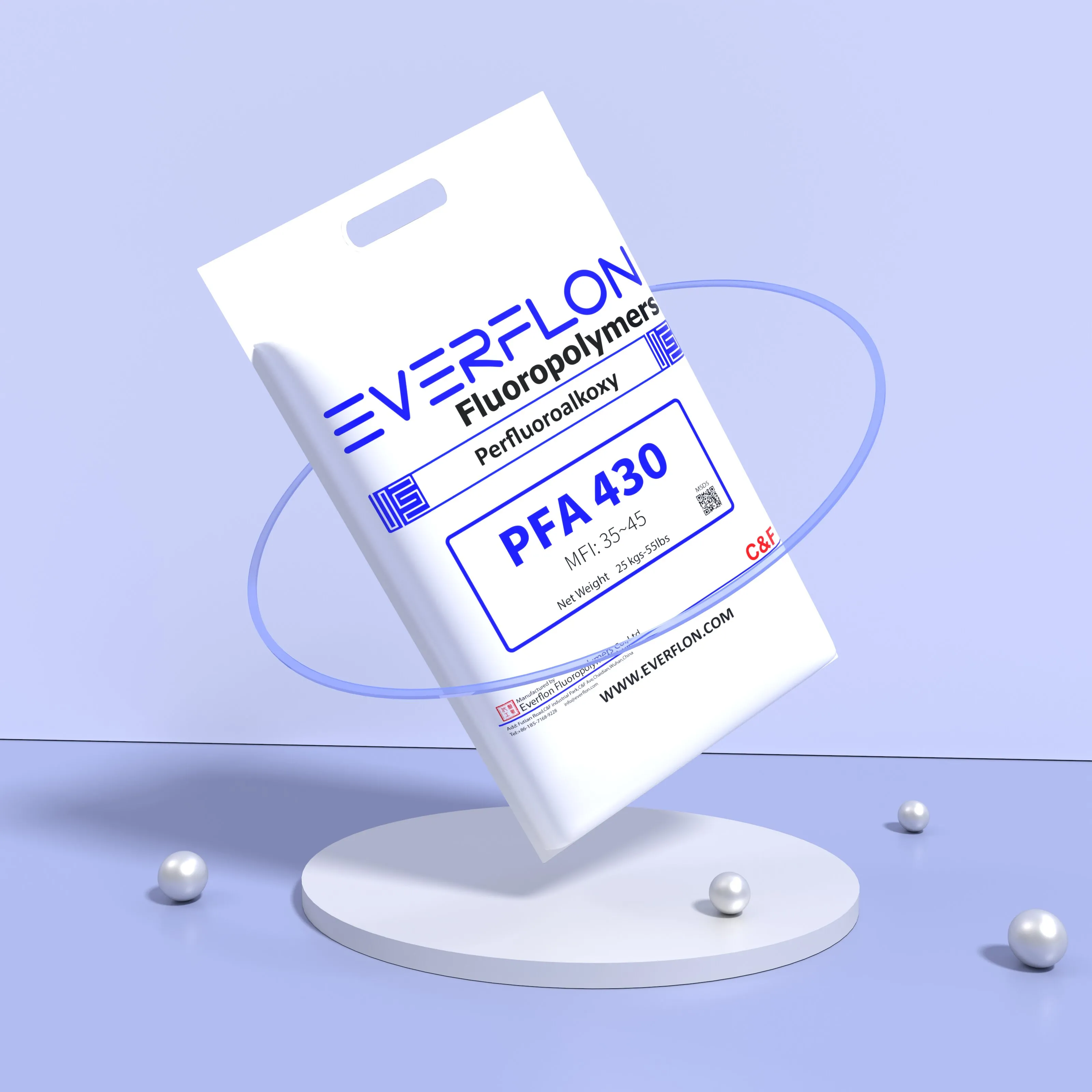 The properties of Everflon™ PFA resin are not affected by storage time. Ambient storage conditions should be designed to avoid airborne contamination and water condensation on the resin when it is removed from containers. Everflon™ PFA is supplied as pellets and is available in 25-kg multilayer bags with an integral polyethylene liner.