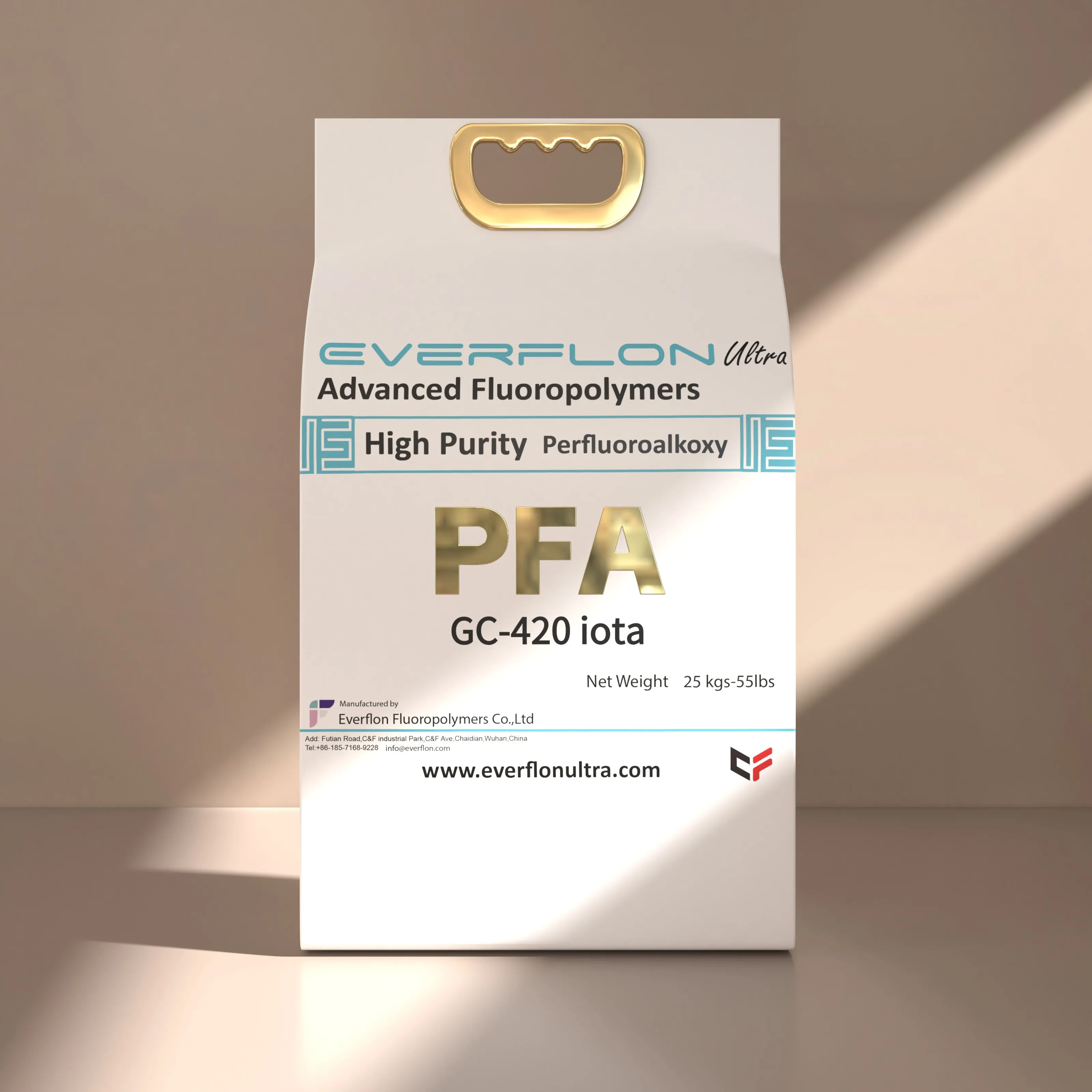 The properties of Everflon™ PFA resin are not affected by storage time. Ambient storage conditions should be designed to avoid airborne contamination and water condensation on the resin when it is removed from containers. Everflon™ PFA is supplied as pellets and is available in 25-kg multilayer bags with an integral polyethylene liner.